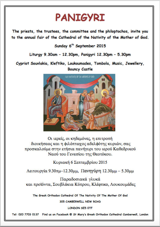 August 17, 2015August 17, 2015 MMR Cathedral Festival – Camberwell Divine Liturgy Sunday 6th September 9.30am-12.30pm Greek Festival: 12:30pm – 5.30pm Share this: Click to share on X (Opens in new window) X Click to share on Facebook (Opens in new window) Facebook Click to share on Pinterest (Opens in new window) Pinterest Click to print (Opens in new window) Print Click to email a link to a friend (Opens in new window) Email Like Loading... Related
